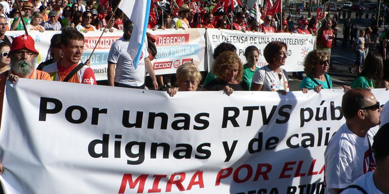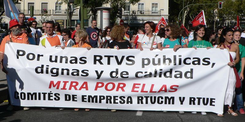 Los compañeros y compañeras de Comisiones Obreras de la RTVA que pudimos ir (unos 50 de las distintas provincias) nos unimos al resto de los/as compañeros/as de las secciones sindicales de la RTVA y decidimos ir con nuestra pancarta al lado del resto de los/as trabajadores/as de las distintas radiotelevisiones públicas españolas, donde Telemadrid tuvo un papel fundamental debido a la situación a la que les están llevando el gobierno de la nación y el de su comunidad autónoma, cuya presidenta acaba de anunciar su dimisión como diputada regional y como dirigente regional, así como su retirada "de la primera línea de la política".