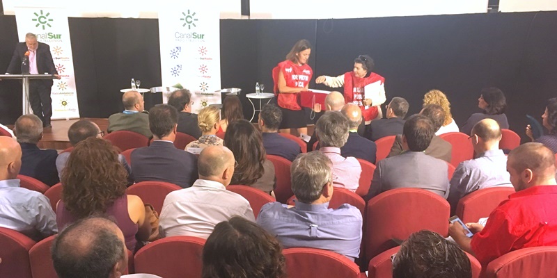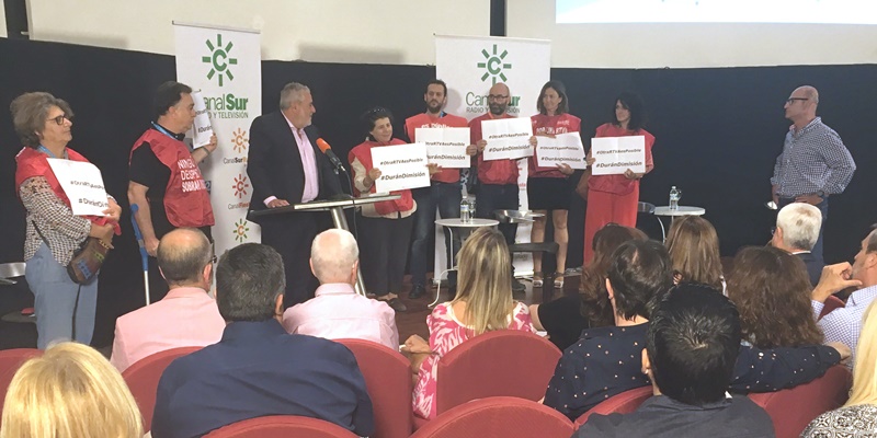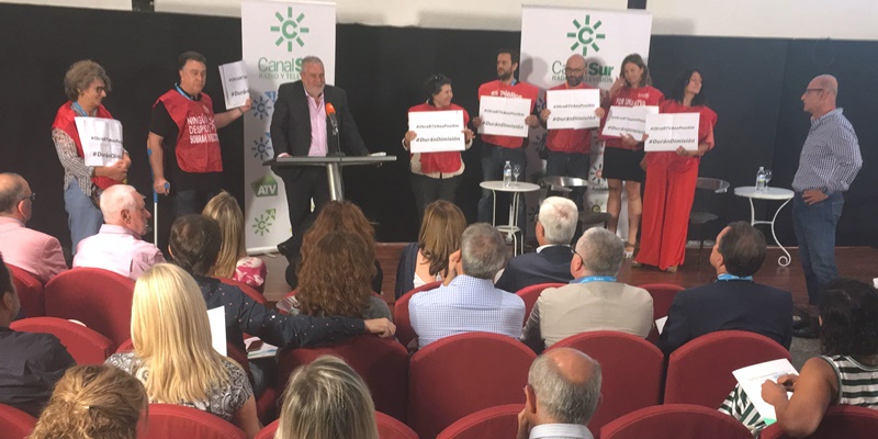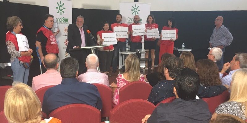 CCOO pide la dimisión de Joaquín Durán y la renovación del Consejo de Administración de la RTVA ante el vicepresidente de la Junta de Andalucía, Manuel Jiménez Barrios, en el marco de la jornada sobre “La radio televisión pública en el entorno digital” celebrada esta mañana en Sevilla.